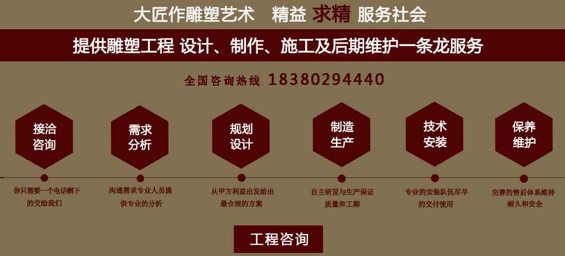 成都大匠作雕塑有限公司,是經(jīng)成都工商局審定注冊的正規(guī)專業(yè)雕塑制作及工程安裝服務機構(gòu),是由一群年輕富有朝氣的年輕人創(chuàng)辦,發(fā)軔于四川省成都市龍泉驛區(qū)。它是一家******于創(chuàng)作、制作和銷售為一體的公司。大匠作擁有多年從事公共藝術的專業(yè)人員和雕塑制作人組成的核心團隊,為您提供專業(yè)、具創(chuàng)新的設計及制作服務。公司成立以來,秉承“******服務、誠信為本”的宗旨,以客戶需求為目標導向,不斷學習,進取,優(yōu)化和提高服務質(zhì)量,公司向您******——“您的滿意***是我們的信譽”,我們將以飽滿的熱情和******的服務贏得您的贊譽和支持。